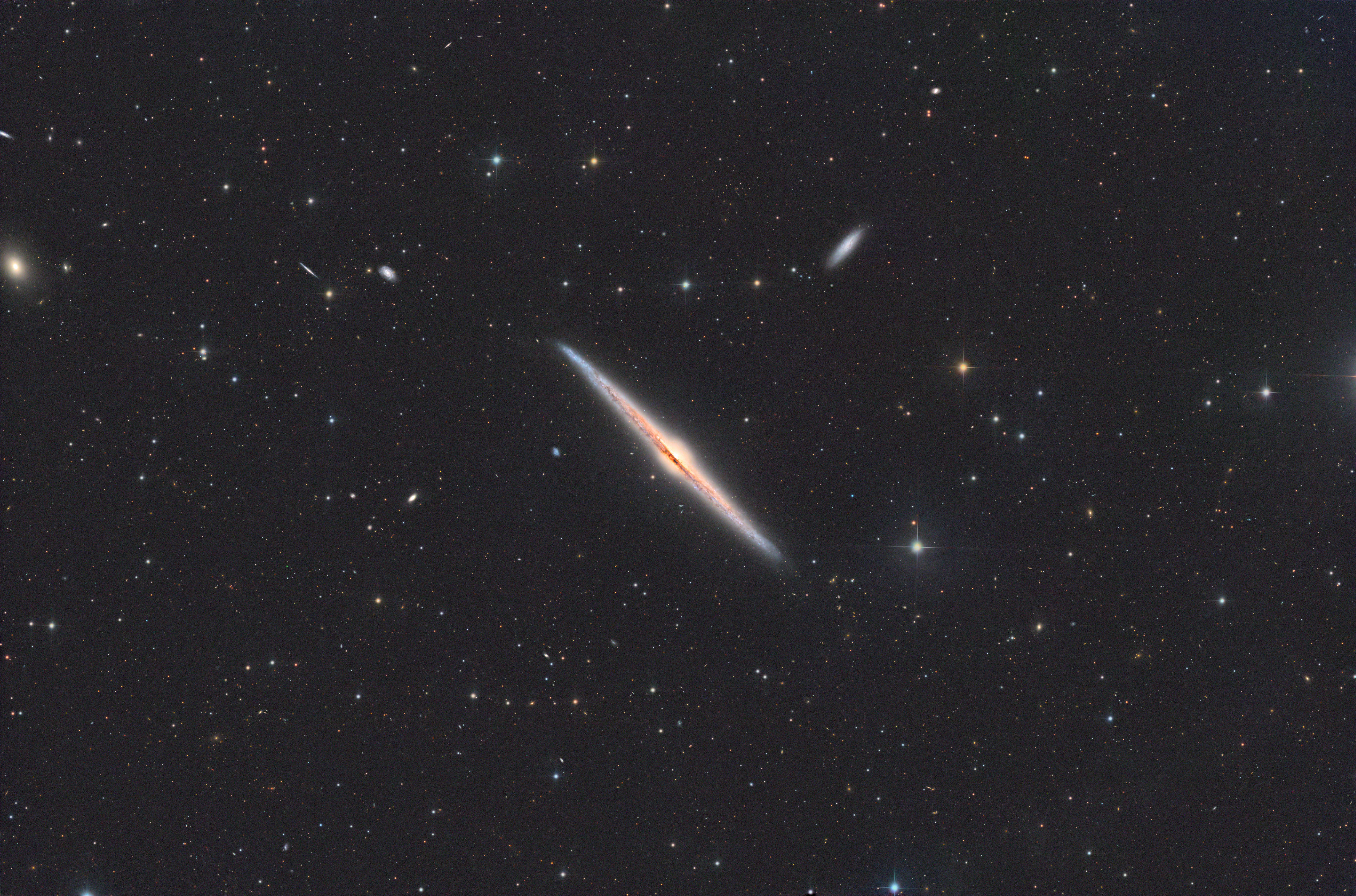 Back NGC4565Needle Galaxy Click to display the full resolution Object InfoTypeSpiral GalaxyConstellationComa BerenicesDistance31,000,000 ly Capture DetailsDateMarch 25, 2026LocationDescanso, CAExposureLum 100x5, R 57x5, G 57x5, B 57x5 (bin 1x1)NotesShot over 4 nights EquipmentOpticsDSI RC10C Corrected RC AstrographFocal Length1867mm @f/7.3MountAstro-Physics 1200GTOCameraPlayer One Zeus 455M PROFocuserBuilt-in Secondary FocuserFiltersAntlia LRGB-V Pro serieSoftwareNINA, PixInsight, Photoshop